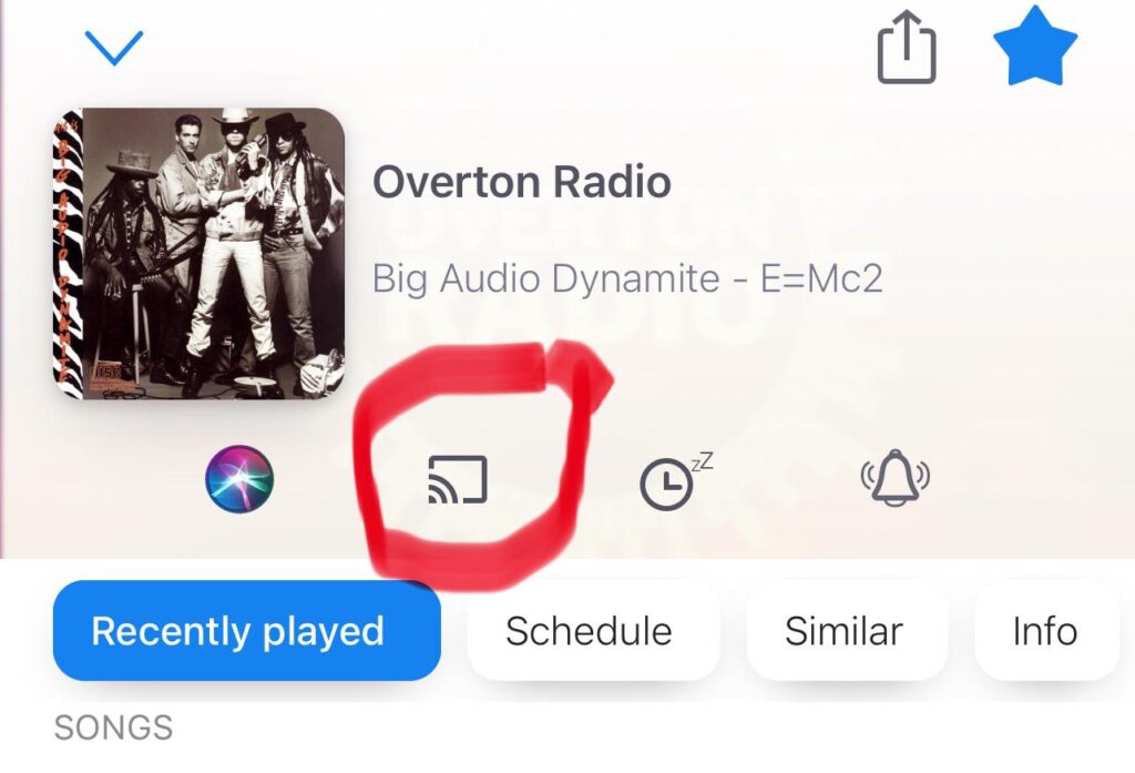 If you have a Google powered device, you will need to download the MyTuner app, and then once you’ve loaded Overton Radio on the app, you can “cast” the station to your device, by click on the cast button, as seen below: