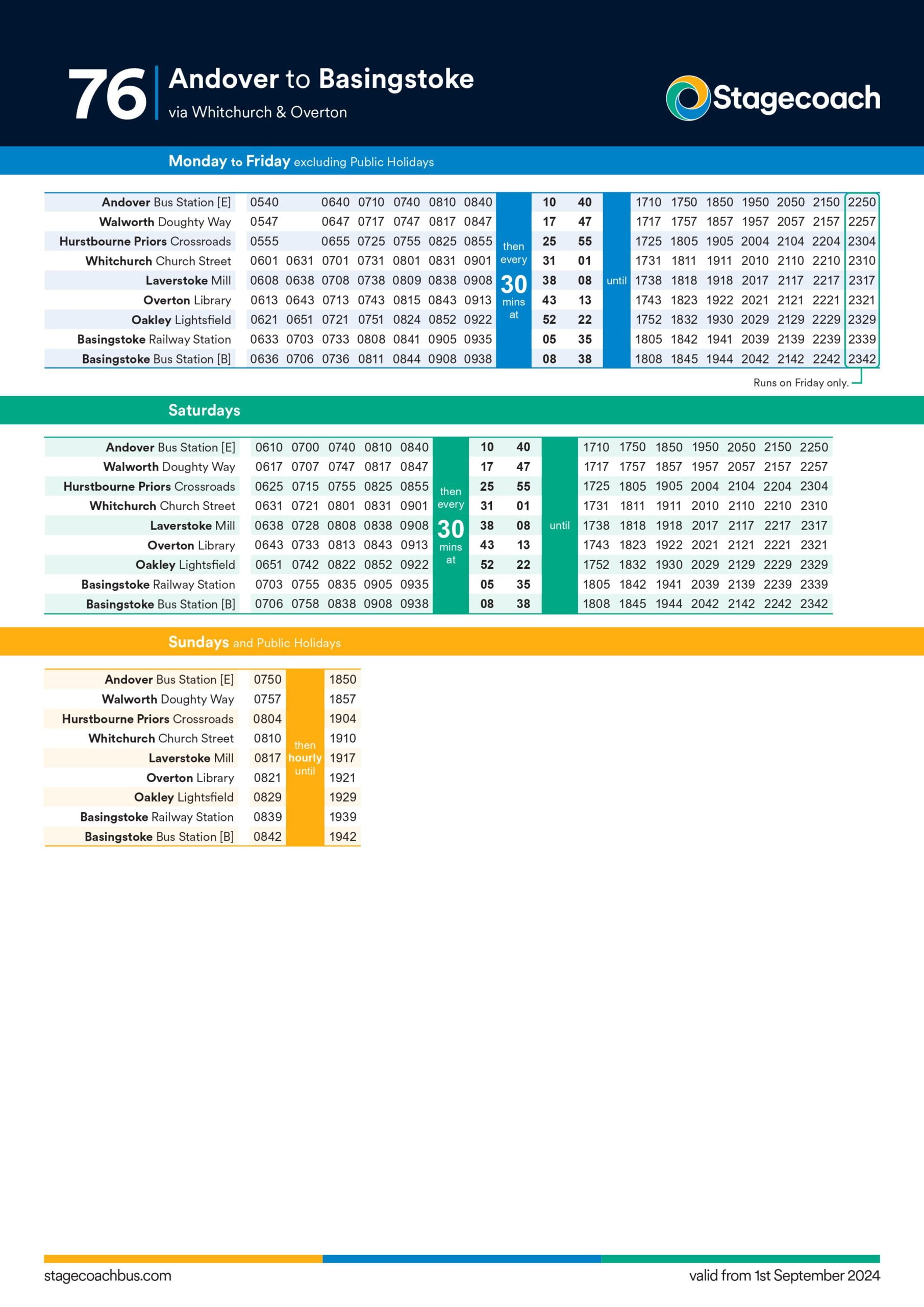 Service 76 will now leave Andover bus station and run direct along Northern Avenue and Churchill Way to the Walworth Industrial Estate. There will be new stops on Churchill Way in the lay-bys adjacent to Pilgrims Way. In Basingstoke buses will serve the railway station both when arriving and leaving the bus station. Buses will run the full route every half hour all day, doubling the service between Andover and Overton. There will be a later journey on Friday and Saturday evenings and two extra round trips on Sundays.